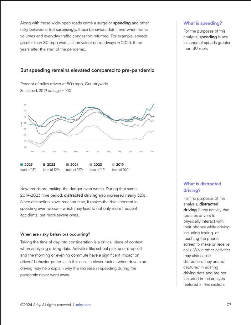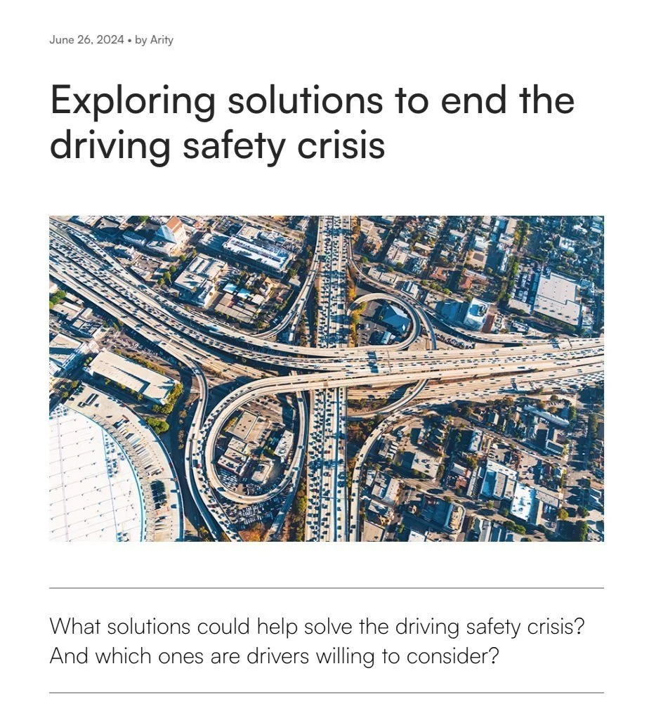 RESEARCH REPORT | Data in action: Solving the driving safety crisis. I drew on internal Arity data and an original survey of 1,000 U.S. drivers to craft this data report that earned placements in The Drive and Forbes.