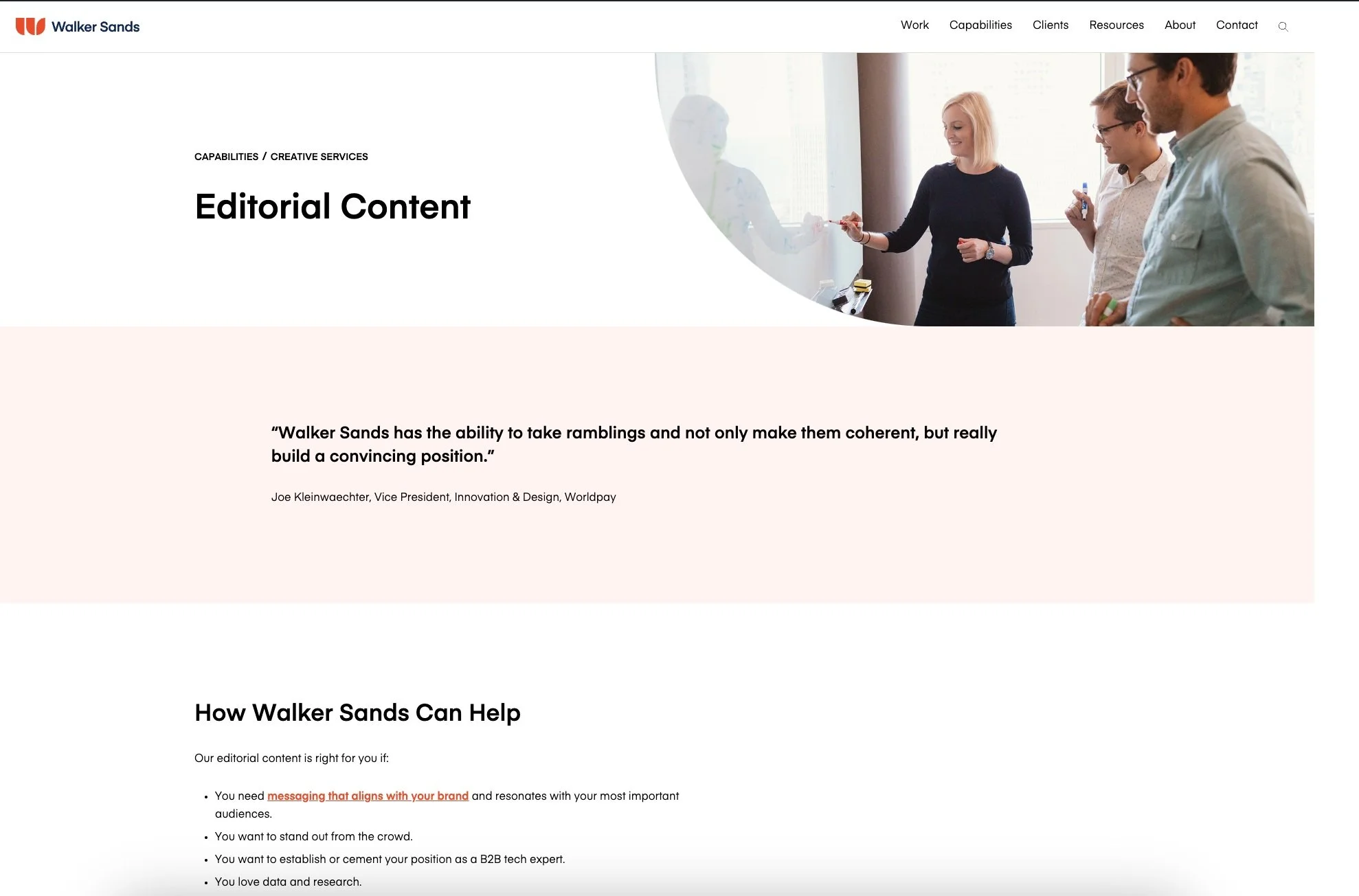 Walker Sands needed to uplevel our web presence to showcase a unique brand identity and point of view. As part of a larger website redesign, I spearheaded the writing of 80+ pages of new web copy to reflect an upleveled brand voice and new messaging focused on outcomes-based marketing. My copy carefully balanced brand priorities with SEO and CRO considerations, creating a website that generates a steady flow of high quality inbound leads for Walker Sands.